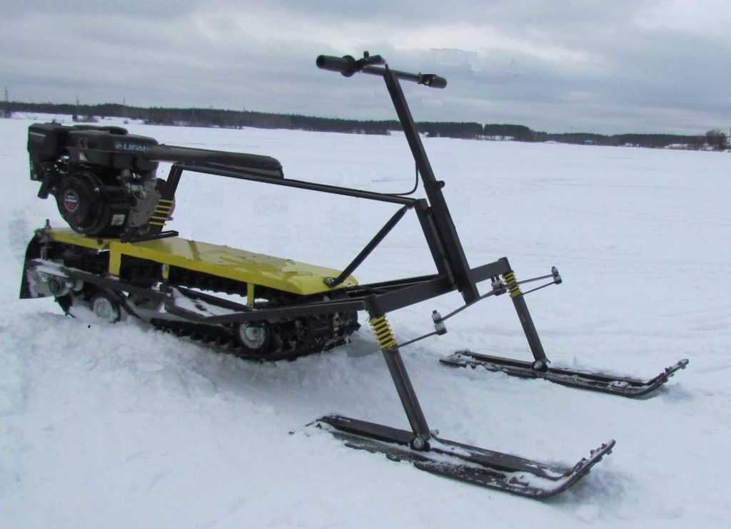 Конструкция мини-снегохода состоит из нескольких завершенных модулей, которые легко собираются и разбираются. Благодаря этому, реально упрощается процесс транспортировки этого транспортного средства.