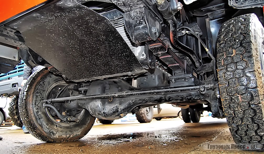 Цепная передача предохраняется от механического воздействия и случайных ударов, дисковый тормоз перекочевал в конструкцию также с УАЗа. Отдельно стоит отметить усовершенствованный блок вала с эластичной муфтой и самофиксирующимся радиальным упорным подшипником. Благодаря доступности и разборной схеме основных узлов, машина показывает высокую ремонтопригодность. В поворотном кулачке имеется ШРУС, обладающий повышенной стойкостью к изнашиванию и увеличенным углом поворотов.