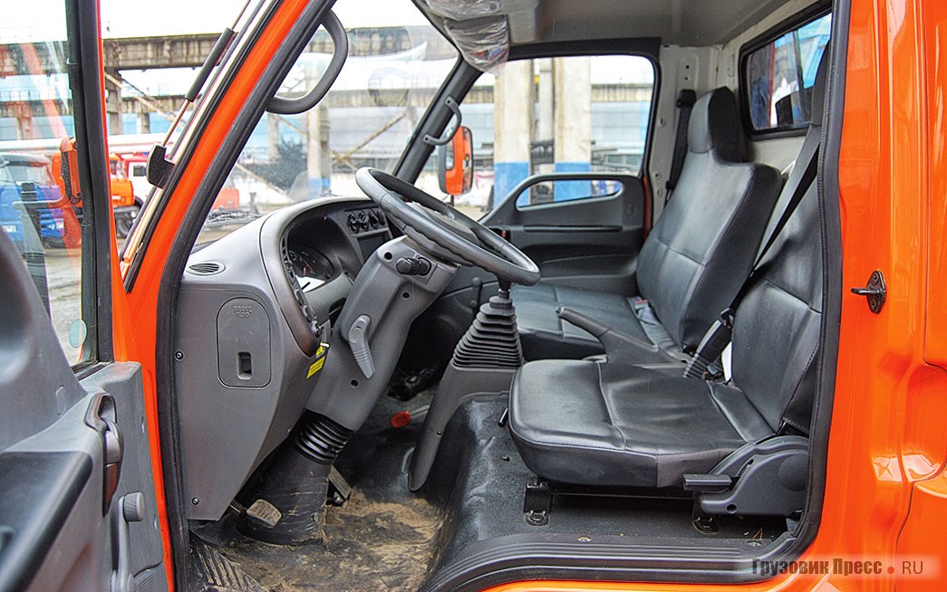 Внимание тут заслуживает механизм включения полного привода. На двух предоставленных на тест-драйв машинах Hyundai HD78 эта система была реализована по-разному: на оранжевом «Дорожном мастере» механизм активации переднего моста включался при помощи компрессора, нагнетающего воздух в пневмоцилиндр, а на автогидроподъёмнике – механическим путём