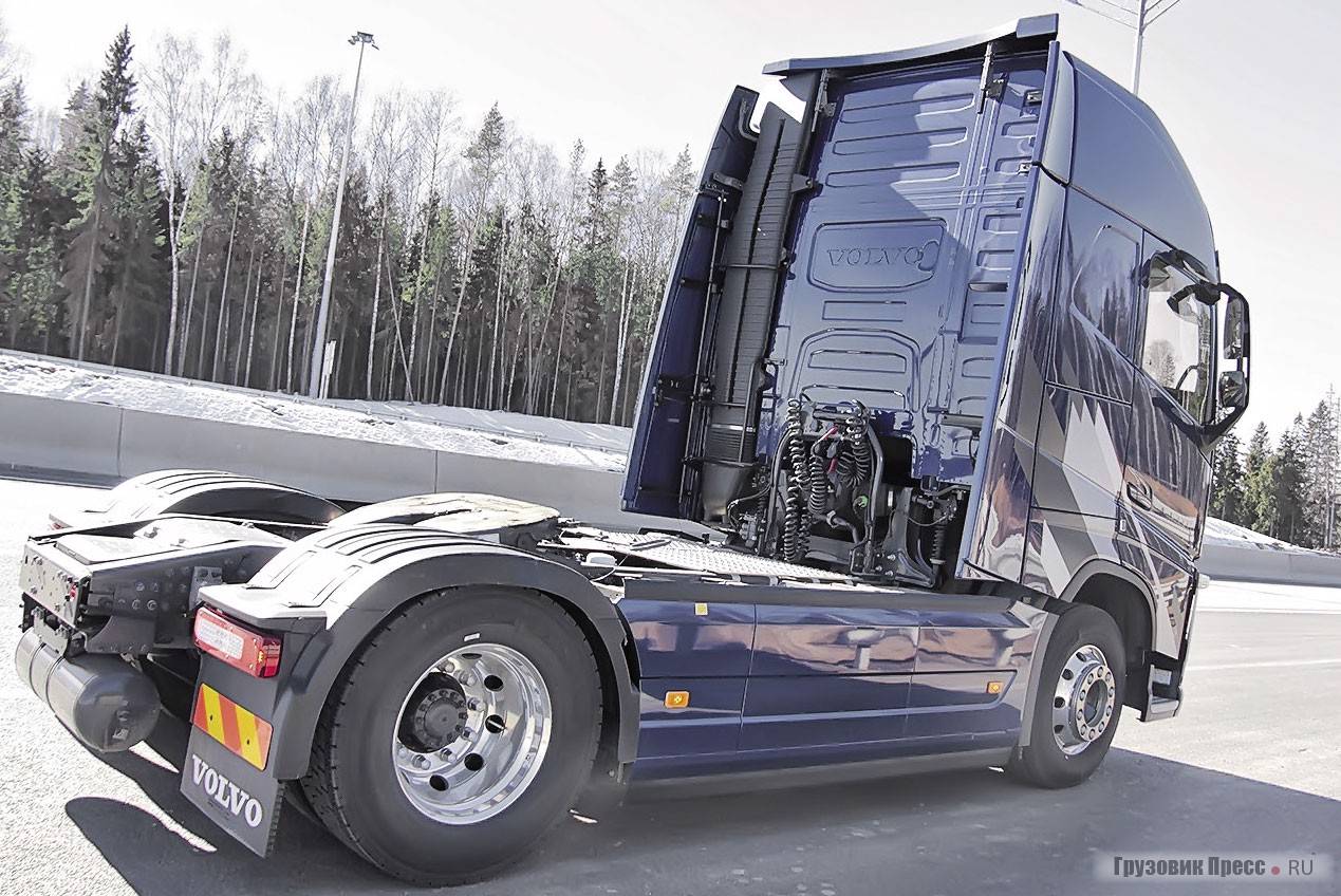 Ещё важный, но спорный для меня момент. Алгоритмизация электроники Volvo FH разрешает подъём кабины при работающем двигателе, это удобно человеку с уверенными слесарными навыками – найти неисправность или обнаружить источник постороннего шума можно буквально «на лету», но можно оказаться и травмированным при неумелом обращении. Впрочем, если не уметь и не знать, тогда и незачем туда лезть. Удивительно, но конструкция подвески кабины здесь очень простая – амортизаторные стойки в четырёх точках и никакой пневмоподвески. И тем не менее обеспечена отличная плавность хода на рабочем месте. И это при том, что необременённый полуприцепом седельный тягач по определению «козлит»! Высший бал – за отсутствие лишних усложнений в виде пневматики без ущерба для комфорта!