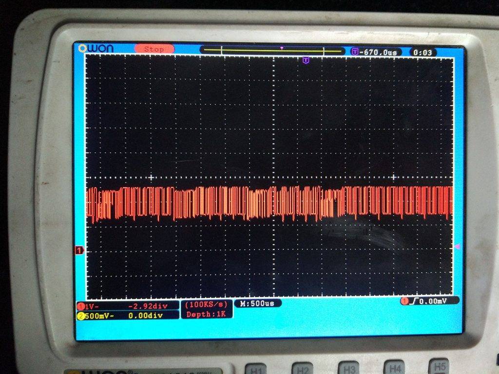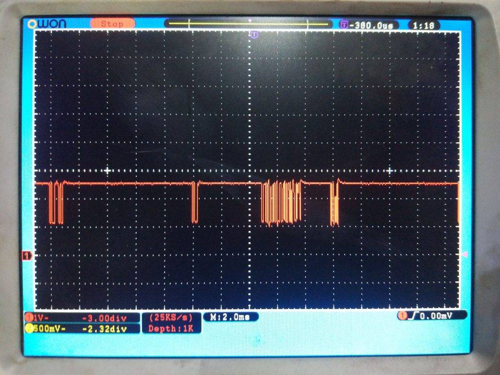 В нашем случае при отключении блока селектора передач GSECU (MID 223) сигнал на экране осциллографа стал исправный.