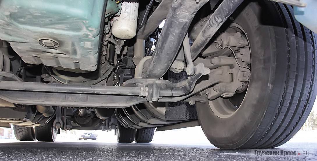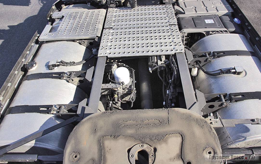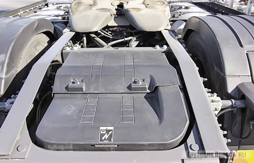 Сразу же замечаю два ёмких топливных бака. Слева – на 900 л, справа – на 530 л дизтоплива и «бачок» на 90 л для реагента AdBlue. База у тягача довольно короткая – 3800 мм, поэтому аккумуляторы, прикрытые пластиковыми щитками, я нашёл в заднем свесе, там же расположены и воздушные ресиверы. Немного непривычную компоновку конструкторы решили сразу же использовать с толком: в торце рамы я обнаружил отдельную панель с воздушными штуцерами и силовую клемму на 24 В для «прикуривания», причём всем этим оборудованием можно воспользоваться без проблем даже при наличии полуприцепа: доступ нормальный.