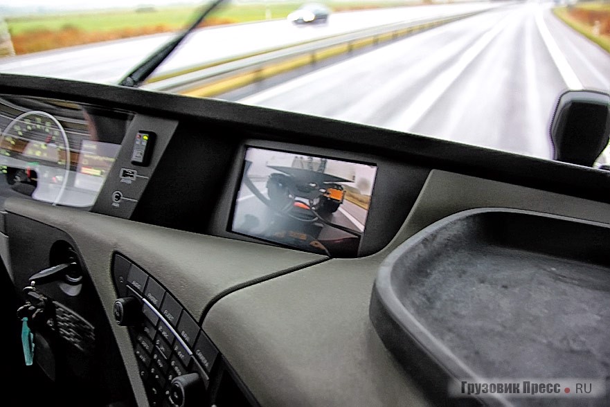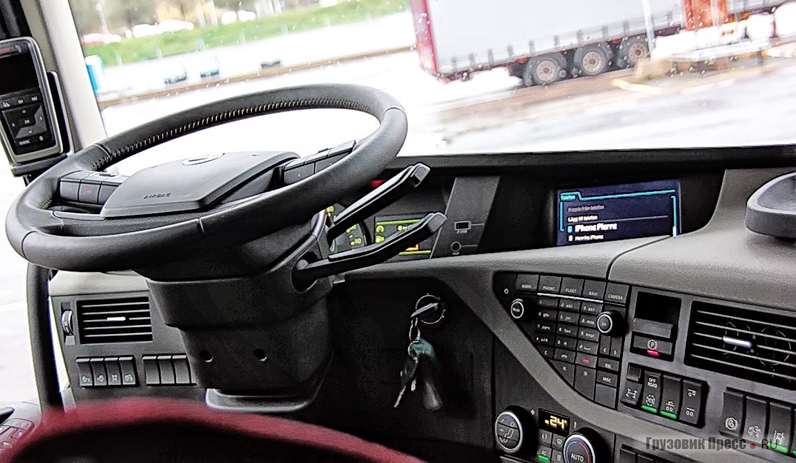 Как рассказали на пресс-конференции, клавиши на панели, кнопки на многофункциональном рулевом колесе и подрулевые переключатели сделаны таким образом, чтобы водитель мог ими пользоваться, не отвлекаясь от управления. На мой взгляд, они расположены иногда слишком близко: я неоднократно случайно касался некоторых кнопок, активируя ненужные мне в данный момент функции и сбивая некоторые настройки. А вместо управления ретардером, переключатель которого расположен справа на рулевой колонке, я переключал режим работы стеклоочистителей, а иногда выходило и наоборот. До опасной ситуации здесь далеко, но в дальнейшем, чтобы не ошибиться, я всё же поглядывал на рычажки.