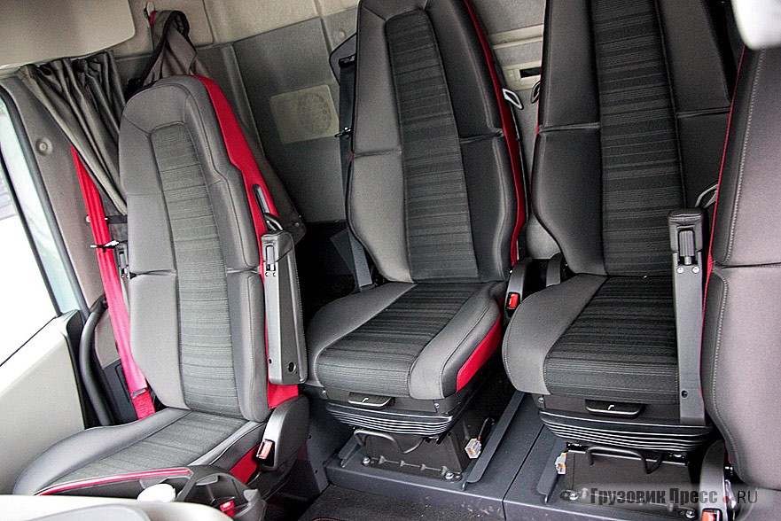 Для водителя производитель создал максимально удобные условия. Здесь устанавливается кресло с продуманной конфигурацией и приятными на ощупь материалами обшивки, которая может быть кожаной или комплексной с тканевыми вставками. Данные сидения устанавливаются только в тягач Вольво.